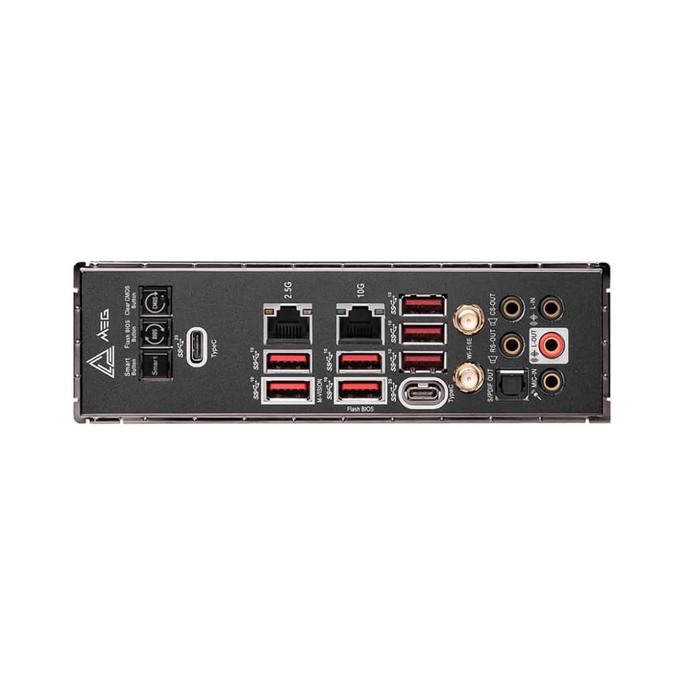 | BACK PANEL PORTS | Clear CMOS Button Flash BIOS Button 2.5G LAN 10G Super LAN USB 3.2 Gen 2 10Gbps (Type-A) Wi-Fi / Bluetooth HD Audio Connectors Smart Button USB 3.2 Gen 2×2 20Gbps (Type-C) USB 3.2 Gen 2 10Gbps (Type-A) USB 3.2 Gen 2 10Gbps (Type-A) USB 3.2 Gen 2×2 20Gbps (Type-C) Optical S/PDIF-Out |