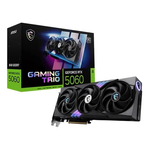 The MSI Nvidia GeForce RTX 5060 Gaming Trio OC is a high-performance graphics card designed for gamers seeking exceptional 1080p and 1440p gaming experiences. Built on Nvidia’s Blackwell architecture, MSI Nvidia GeForce RTX 5060 Gaming Trio OC offers cutting-edge features like DLSS 4, Multi Frame Generation, and advanced ray tracing capabilities. With 8GB of GDDR7 VRAM and a robust triple-fan cooling solution, this card ensures smooth gameplay and efficient thermal management.