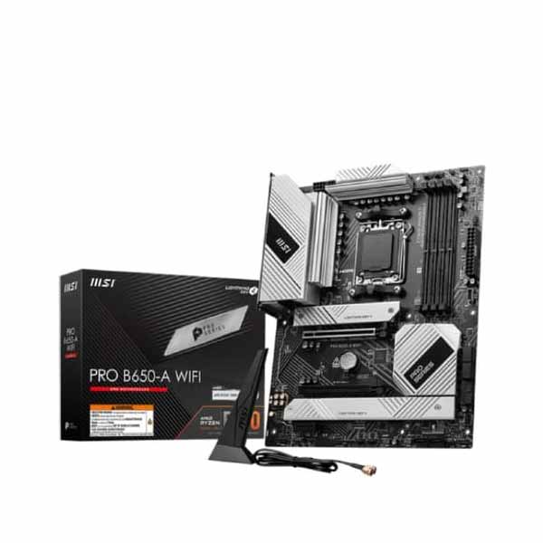 The MSI Pro B650-A WiFi is a robust ATX motherboard on AMD’s B650 chipset for the AM5 socket, supporting Ryzen 7000/8000/9000 series CPUs. MSI Pro B650-A WiFi offers up to DDR5‑7600+ MHz (OC), three PCIe 4.0 M.2 slots, including dual slots wired to the CPU, Wi‑Fi 6E + Bluetooth 5.3, 2.5 GbE LAN, a powerful 14+2+1-phase VRM, and business-class cooling—making MSI Pro B650-A WiFi ideal for productivity setups and high-performance builds