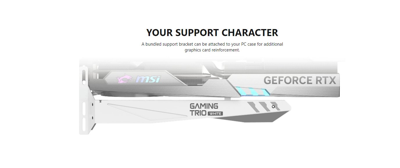 A bundled support bracket can be attached to your PC case for additional graphics card reinforcement in MSI RTX 4070 Ti Super Gaming X Trio 16GB White Graphics Card.