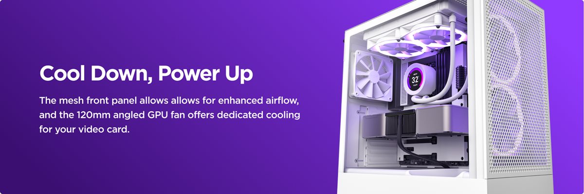 • NZXT H5 Flow White Cabinet has Dedicated fan on bottom inside panel is angled to cool GPU