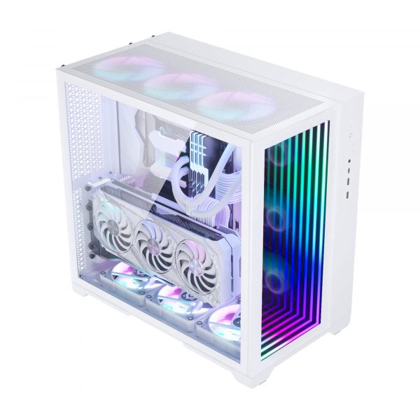 The Phanteks Metallic Gear Neo Qube 2 Infinity Mirror White from Magnium Gear is a true showcase mid-tower chassis without compromise. Its dual chamber design makes installation and cable management a breeze while all system components are highlighted through the double tempered glass panels. What sets the NEO Qube 2 apart is it’s infinity mirror coating on the front glass panel and built-in lighting effects. This changes the tempered glass front panel to an endless Digital-RGB view like no other, yet you will have a good view of the systems components through the side glass panel.