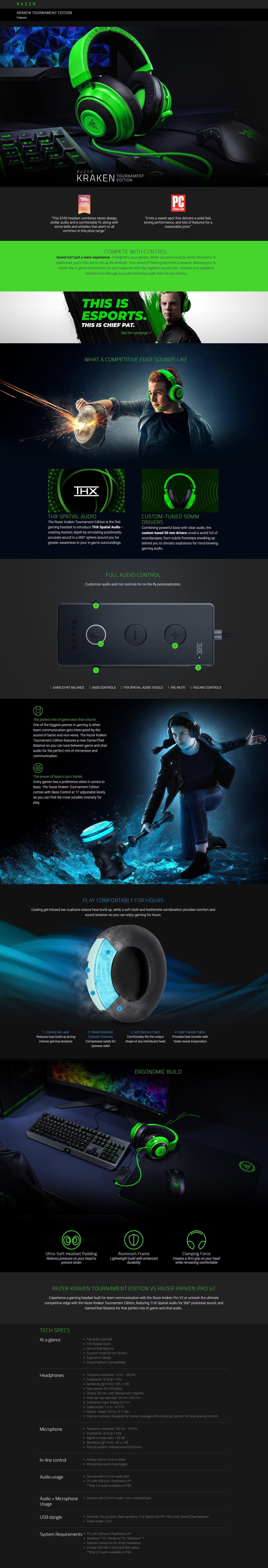 The Razer Kraken Tournament Edition is the first gaming headset to introduce THX Spatial Audio—creating realistic depth by simulating positionally-accurate sound in a 360° sphere around you for greater awareness in your in-game surroundings.