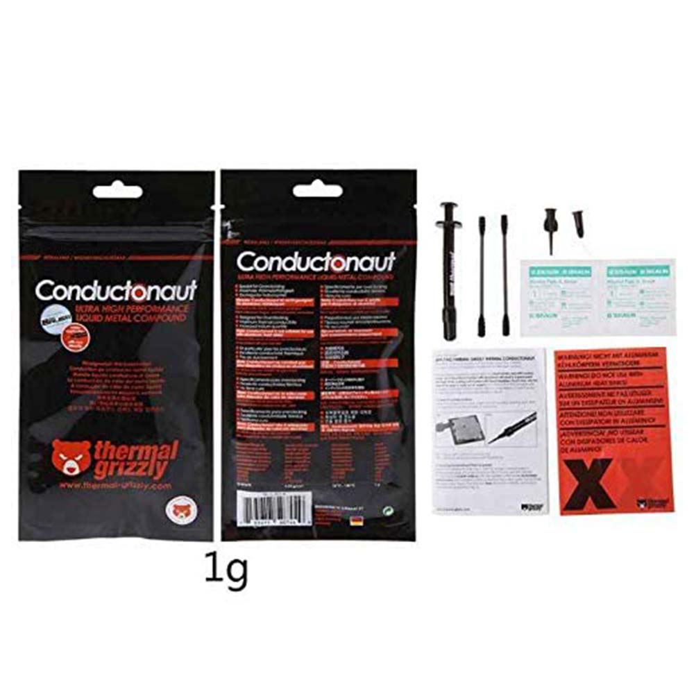 Thermal Grizzly Conductonaut is a liquid metal thermal compound based on a eutectic alloy. Our special mixture of metals like tin, gallium and indium, Conductonaut excels with a very high thermal conductivity. We recommend to apply Conductonaut on nickel plated surfaces since this will provide the best long term stability in performance.