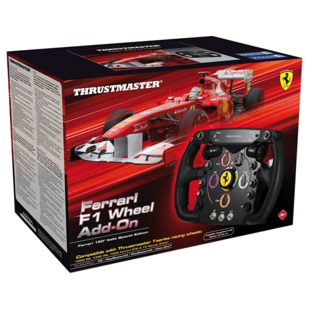 | Box Content | – 1 detachable Ferrari F1 Wheel Add-On wheel (compatible with the Thrustmaster ecosystem*) – user manual and consumer warranty information. |