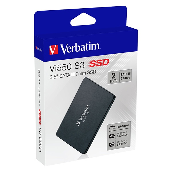 Verbatim 2.5” SATA III 7mm solid state drives can revitalise the performance of your system. Using the latest 3D NAND technology they offer the perfect way to upgrade from either hard drive or an older SSD. The Vi550 has a superior controller for increased reliability, larger capacities and faster read/write speeds.
