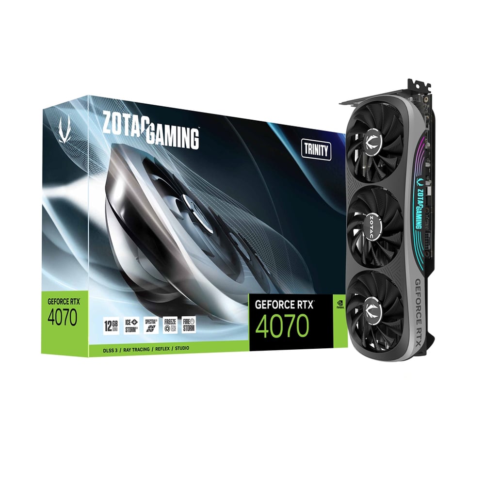 A balanced take on the signature aerodynamic-inspired design, the Zotac RTX 4070 Trinity 12GB Graphics Card utilizes the state-of-the-art NVIDIA Ada Lovelace architecture to give gamers cutting-edge features such as DLSS 3 and real time raytracing. Complete with the advanced cooling design derived from flagship models, the Zotac RTX 4070 Trinity 12GB Graphics Card packs the punch to deliver blistering FPS in the latest titles.
